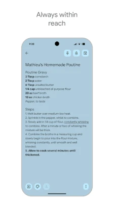 Са Google Keep-ом, ваше белешке су увек ту, без обзира на то који уређај користите. Било да сте на телефону, таблету, рачунару или паметном сату са Wear OS-ом, све што додате аутоматски се синхронизује преко свих платформи, осигуравајући да су ваше идеје и подсетници увек доступни. Никада више не пропустите важну ствар захваљујући паметним подсетницима. Подесите подсетник на основу локације – на пример, да вам се листа за куповину прикаже чим стигнете у продавницу – или временске подсетнике за састанке и обавезе. Google Keep се прилагођава вама, стављајући праву белешку у право време на право место.